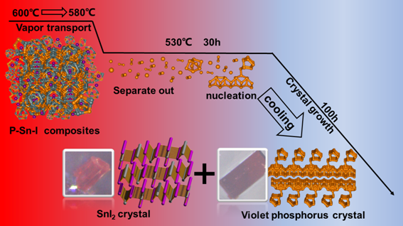 张锦英课题组首次合成宏观紫磷单晶并准确解出其晶体结构,该结构虽然与Hittorf的结构有相似之处,但是其单晶实际为暗红色的透明晶体,紫磷同时被发现是最稳定的磷的同素异形体。为了进一步探索紫磷及紫磷稀的物理化学性能及未来的潜在应用,高产率合成紫磷晶体是关键。