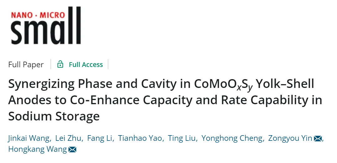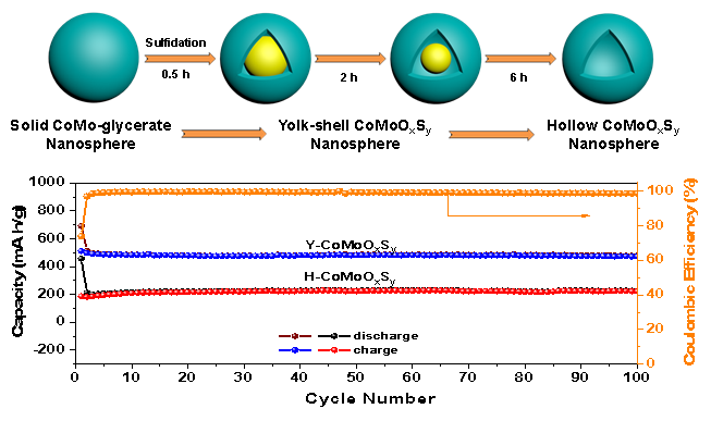 此外,针对硫化物负极材料在嵌脱钠过程中体积变化所导致的结构应力和电极破碎失效问题,课题组以钴钼-甘油实心球为前驱体,通过控制水热硫化时间,实现了CoMoOxSy核壳中空结构到CoMoSy空心球结构的有效调控,发现核壳结构可以有效缓解电极材料在嵌钠/脱钠过程中的体积膨胀/收缩,从而提高材料的结构稳定性。该研究工作以“Synergizing Phase and Cavity in CoMoOxSyYolk–Shell Anodes to Co‐Enhance Capacity and Rate Capability in Sodium Storage(物相/腔体协同调控增强CoMoOxSy核壳结构负极储钠容量和倍率性能)”为题发表在材料领域top期刊Small (影响因子11.459)。论文第一作者为休闲小栈