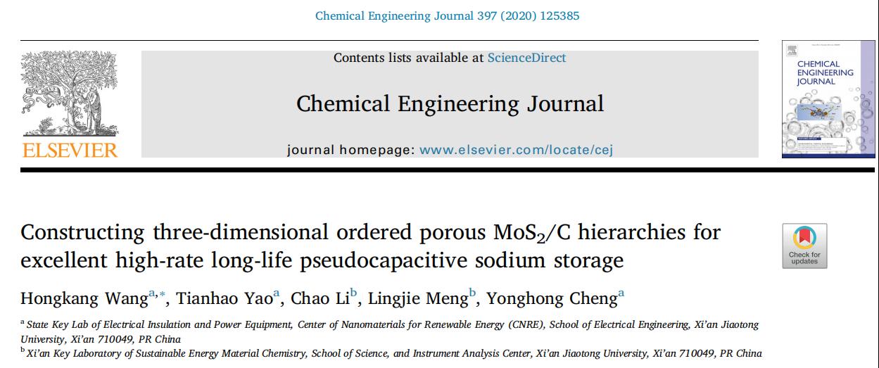王红康副教授课题组采用模板结合纳米铸造(Nanocasting) 的方法,成功设计并构筑了由超薄MoS2/C中空/多孔球相互交联形成的三维等级结构。借助模板剂(均一氧化硅球)的引入并去除,实现了电极材料的三维多孔等级构筑,避免了材料堆叠团聚,提高了电解液-电极界面接触性能。碳源的引入,使得MoS2(002)晶面层间距显著增加,同时提高了材料的结构稳定性和导电性。作为钠离子电池材料,该电极实现了结构稳定性、导电性和界面接触性能的有机结合,表现出了优异的储钠容量、循环稳定性和高倍率性能,在2A/g大电流密度下循环500圈容量仍能保持412mAh/g(高于锂电池石墨负极的理论比容量372mAh/g),甚至在10、20和50A/g大电流密度下循环5000圈,容量仍能分别保持在156、128和76mAh/g(目前常用钠电正极Na3V2(PO4)3和NaFePO4的理论分别为~118和154mAh/g)。该材料表现出了优异的赝电容储钠性能,对于开发兼具高能量密度和高功率密度的赝电容储能设备(如钠离子电容器)具有重要的指导意义。该研究工作以“Constructing Three-Dimensional Ordered Porous MoS2/C Hierarchies for Excellent High-Rate Long-Life Pseudocapacitive Sodium Storage(构筑三维有序多孔MoS2/C等级结构实现优异高倍率长寿面赝电容储钠性能)”为题,发表在国际化学工程领域top期刊Chemical Engineering Journal (化学工程,影响因子10.652),休闲小栈