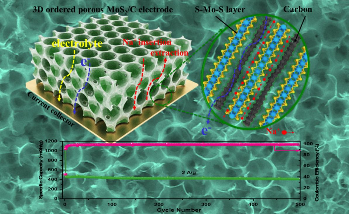 新能源发电、智能电网、电动汽车等领域的发展,需要先进的大规模储能技术支撑。目前,最常见的电化学储能装置——锂离子电池,面临着锂资源有限、价格昂贵等问题,难以满足其可持续发展,亟需探索低成本、高效规模储能技术。钠离子电池具有和锂离子电池相似的工作原理,然钠资源丰富、价格低廉。因此,钠基电池在规模储能领域具有显著的优势和巨大的应用潜力。然而,钠离子具有较大的离子半径,商用锂离子电池的负极材料石墨无法适用于钠离子电池,因此,开发新型高性能钠离子电池负极材料至关重要。层状二硫化钼(MoS2)是具有类石墨烯结构的金属硫化物,S-Mo-S层间通过弱范德华力结合,具有较大的层间距,有利于钠离子的嵌入/脱出,是一种极具潜力的储钠材料。然而,MoS2在嵌钠/脱钠过程中伴随着体积膨胀/收缩,容易导致电极破碎失效和容量的快速衰减。此外,MoS2自身较差的导电性也限制了其电化学性能的发挥。