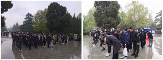 大地回春,清明雨上。四月初的西安烈士陵园在淅沥小雨中更显肃穆。参与活动的学生皆身着素装,手持鲜花,神色凝重。在烈士纪念碑前,学生们整齐列队,为革命先烈默哀三分钟,并向纪念碑敬献花圈挽联,鞠躬致敬。