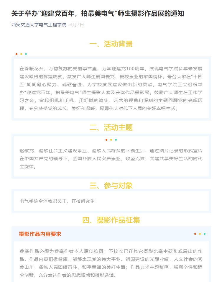 工会于2021年4月发起举办 “迎建党百年,拍最美电气”师生摄影大赛及获奖作品摄影展。经过为期2个月的投稿、筛选与专业评审,确定了最终的获奖名单。本次获奖作品还将在“七一”党的百年诞辰之际在创新港3号巨构躬行楼一层大厅进行展示,届时欢迎广大师生移步参观。