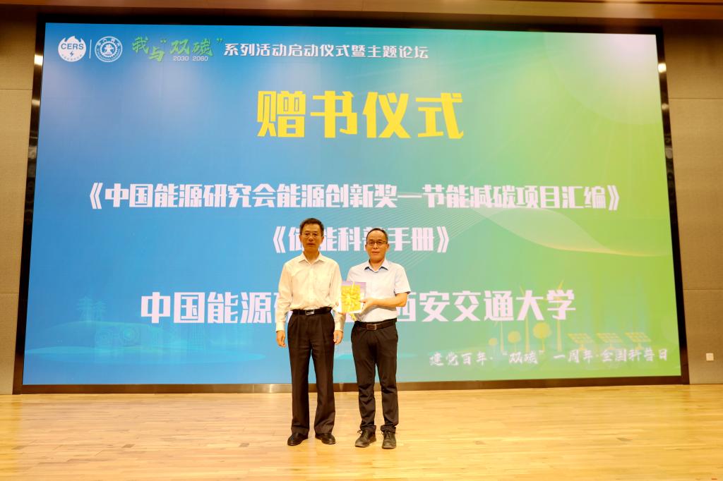 党委书记梁得亮宣读倡议书,孙正运介绍了《中国能源研究会能源创新奖节能减碳项目汇编》和《储能科普手册》的有关情况并向学校赠书,西安交大图书馆副馆长杨峰代表学校接受赠书。