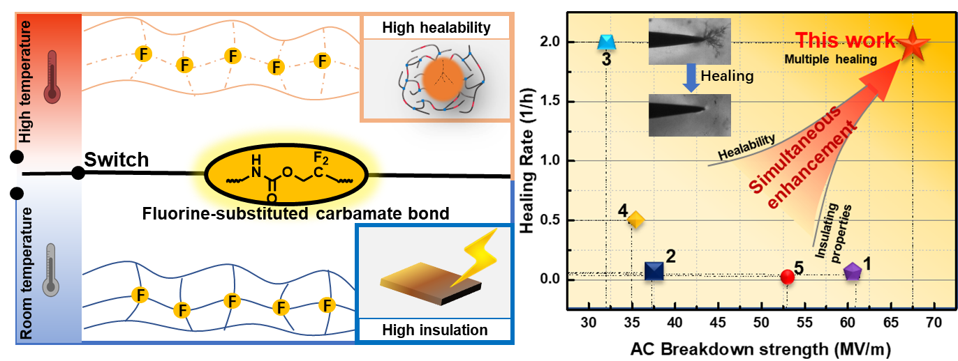 以电树枝为代表的电损伤是绝缘材料中最常见的电老化现象,严重影响聚合物绝缘材料长期服役寿命,是领域长期以来备受关注的经典问题。目前主要从预防和抑制的角度来应对电损伤,而如果能赋予绝缘材料修复能力,则可以为保障绝缘材料的可靠性建立一道新防线,对于延长设备使用寿命、提高电力系统运行稳定性具有重要意义。然而,传统可修复材料主要侧重于机械性能修复,许多用于实现修复的关键结构会显著影响材料的绝缘性能。因此,如何实现高效电损伤修复同时保障材料绝缘性能成为了可修复绝缘材料发展和应用的关键问题。