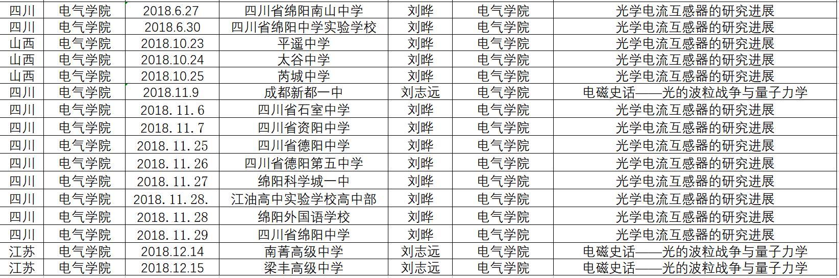 电工电子国家级实验教学中心刘晔教授、刘志远教授,先后走进四川、山西、江苏3省,在绵阳南山中学、绵阳中学实验学校、平遥中学、太谷中学、芮城中学、成都新都一中、四川省石室中学、四川省资阳中学、四川省德阳中学、四川省德阳第五中学、绵阳科学城一中、江油高中实验学校高中部、绵阳外国语学校、四川省绵阳中学、南菁高级中学、梁丰高级中学等16所中学开展“教授进中学科普讲座”活动。分别为师生带来16场题为《光学电流互感器的研究进展》、《电磁史话——光的波粒战争与量子力学》的主题报告。生动且深入浅出的讲解,让中学生们深刻体味和感悟着电气学科的魅力,受到广大师生的热烈欢迎。