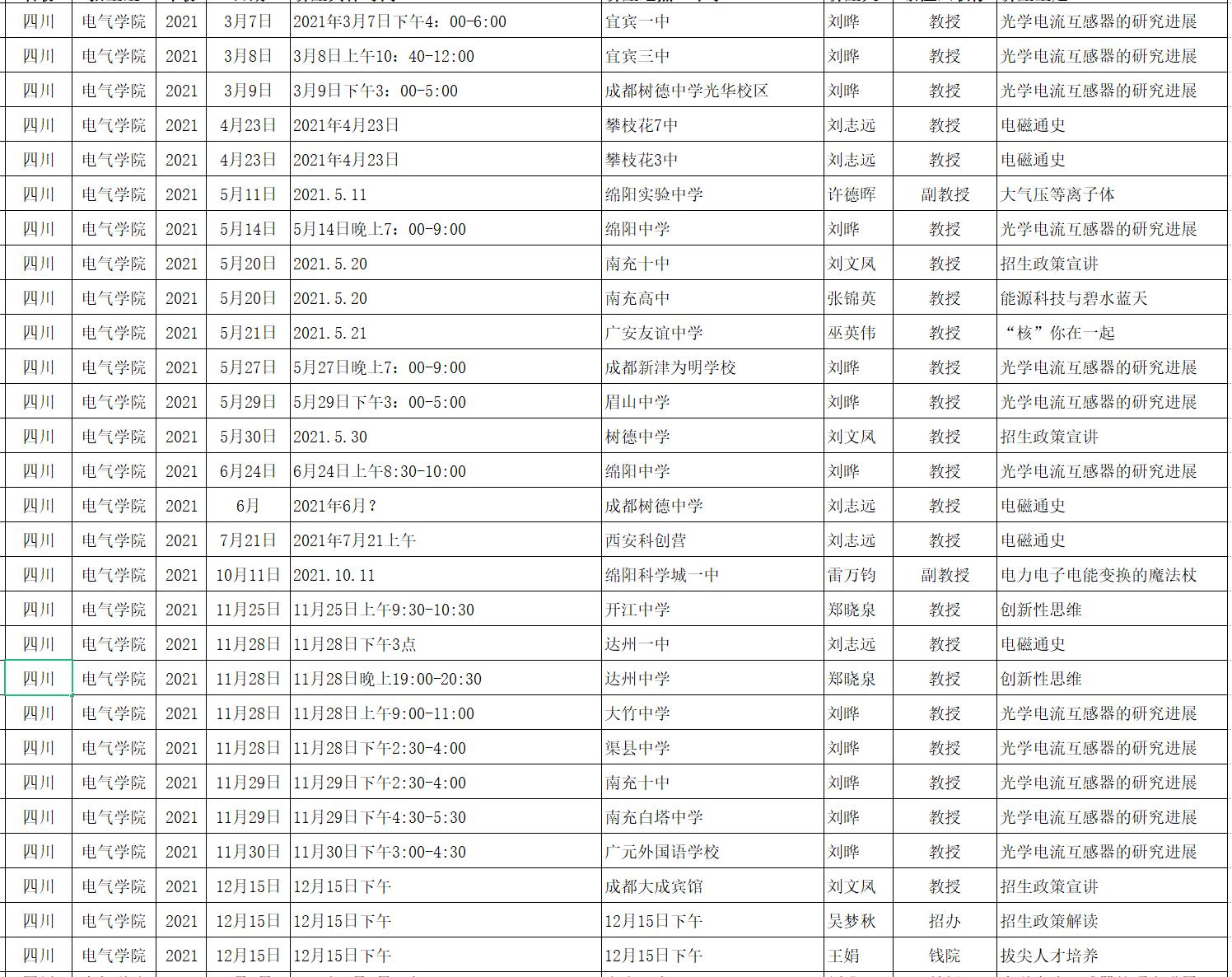 电工电子国家级实验教学中心刘晔教授、刘志远教授、许德晖教授、刘文凤教授、张锦英教授、雷万钧教授、郑晓泉教授等多位教授,分赴成都、宜宾、攀枝花、绵阳、广安、南充、达州等多地中学及地区,做《光学电流互感器的研究进展》、《电磁通史》、《大气压等离子体》、《光学电流互感器的研究进展》、《创新性思维》、《电力电子电能变换的魔法杖》、《能源科技与碧水蓝天》等专题讲座,开展招生政策解读并详细解析拔尖人才的培养理念和方法。影响广泛,反应热烈。