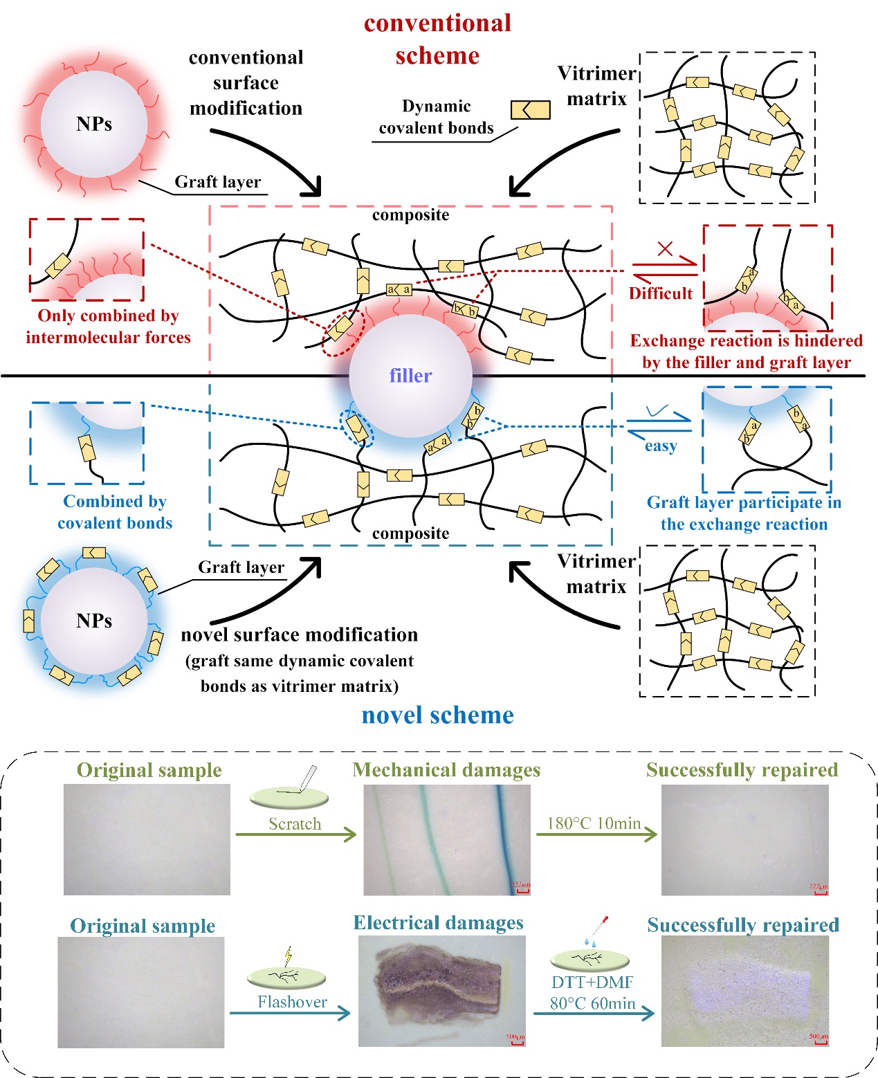 近年来,随着动态共价键技术的发展,可修复机械损伤的聚合物电介质材料已经成为现实。然而,关于高性能和可修复电损伤的高介电复合材料的相关研究仍鲜有报道。这主要是由于以下的技术瓶颈:(1)引入动态共价键可能导致材料性能下降,难以获得兼具高介电性能和可修复性的高介电复合材料;(2)不同于单一组分的热固性材料,高介电复合材料含有的较多填料限制了动态共价键的修复作用;(3)不同于机械损伤,电损伤往往破坏材料有机结构并生成残碳,其更难被传统的动态共价键交换修复。
