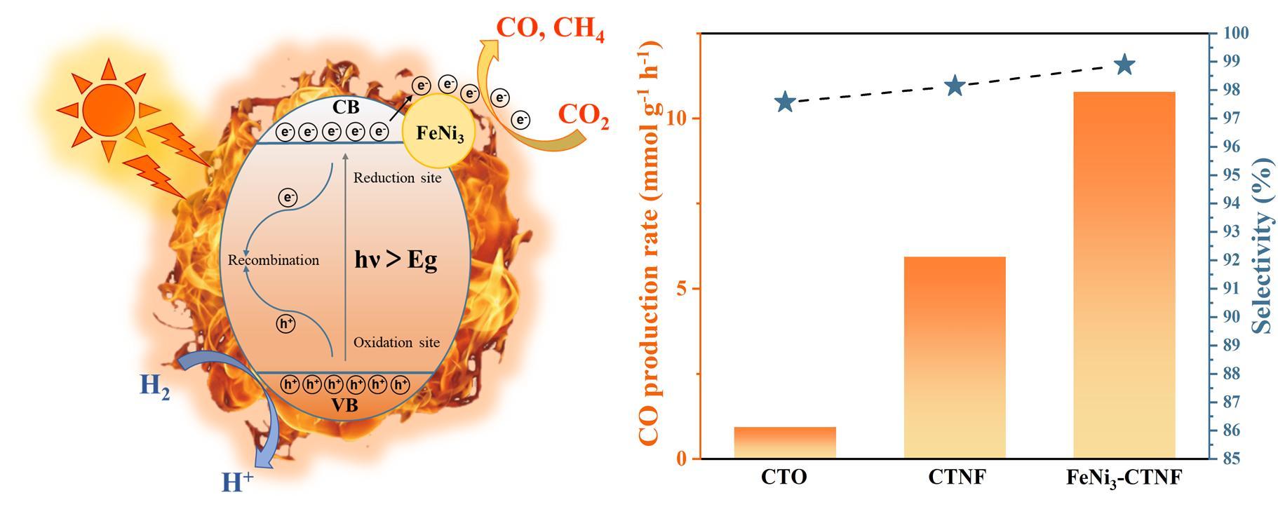 吴锴、周峻课题组首次通过介质阻挡放电等离子在钙钛矿Ca0.9Ti0.8Ni0.1Fe0.1O3氧化物表面原位生成了NiFe金属纳米合金颗粒。等离子体出溶的钙钛矿制备方法简单,易于操作,耗时短,绿色清洁,且出溶的金属纳米颗粒尺寸小、分散度高、分布均匀。由于等离子体出溶的催化剂有着较窄的带隙,光生电子向金属合金颗粒的迁移,较多的表面氧空位以及增加的活性位点,因此在光热条件下有着优异的RWGS反应活性。该工作提供了一种新的策略来制备金属-半导体异质结构的高效光热CO2还原催化剂,其优异的催化性能也可以用于其他领域。