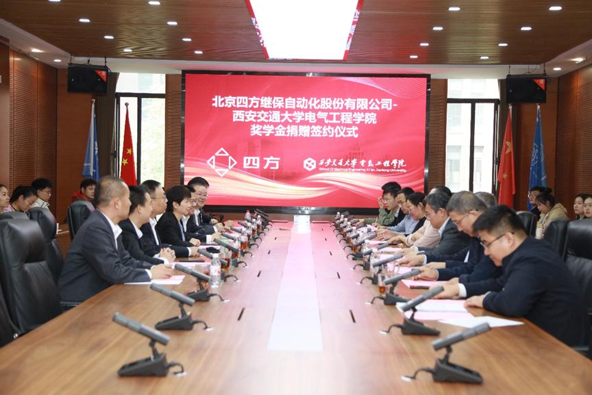 谢勇和赵力代表校企双方签署了奖学金捐赠协议,别朝红为四方股份颁发捐赠铭牌。签约仪式前,参会双方共同参观休闲小栈