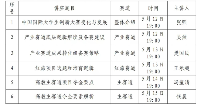 5月12日-5月15日,学院组织全部75个项目团队的负责同学参加中国国际大学生创新大赛变化与发展、产业赛道底层逻辑解读及备赛建议、产业赛道成果转化组备赛策略、红旅项目选题和培育逻辑、高教主赛道项目夺金要点、高教主赛道夺金要素解析等6个主题的专题培训。