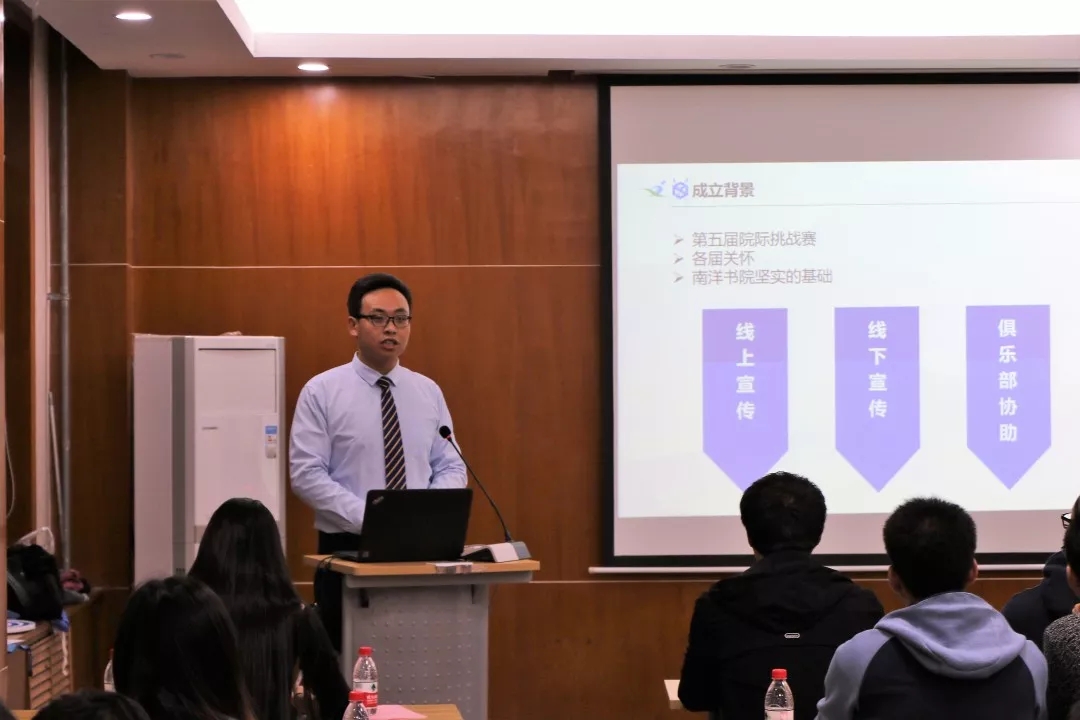 学生赛艇俱乐部经理何骁翔同学走上讲台,向大家详细的介绍交大赛艇十年发展所取得的成绩与目前的规模,截至目前交大赛艇已经取得了十三届全运会“群众体育先进单位”等国家级荣誉多项,在香港赛艇锦标赛、查尔斯河赛艇挑战赛、国际名校赛艇挑战赛等国际大赛中取得了优异的成绩,尤其是在刚刚结束的世界大学生赛艇锦标赛上交大代表代表中国队共派出了49人中22人参赛,并为国家赢得了一枚银牌。他还鼓励电气赛艇队能够尽快成为交大赛艇俱乐部强有力的一分子,期待在比赛中能够尽快看到电气赛艇的队伍。