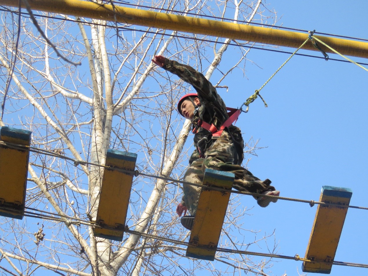 第四个训练科目是单人挑战项目——飞夺缅甸桥。这也是本次素质拓展训练中最为精彩的一个环节。学员需要在8m的高空,克服自己内心的恐惧,通过缅甸桥,战胜自我。个别学员由于恐高心理,开始时难免有所畏惧,但在队友的鼓励下克服困难成功登上高空,最终完成挑战任务。休闲小栈