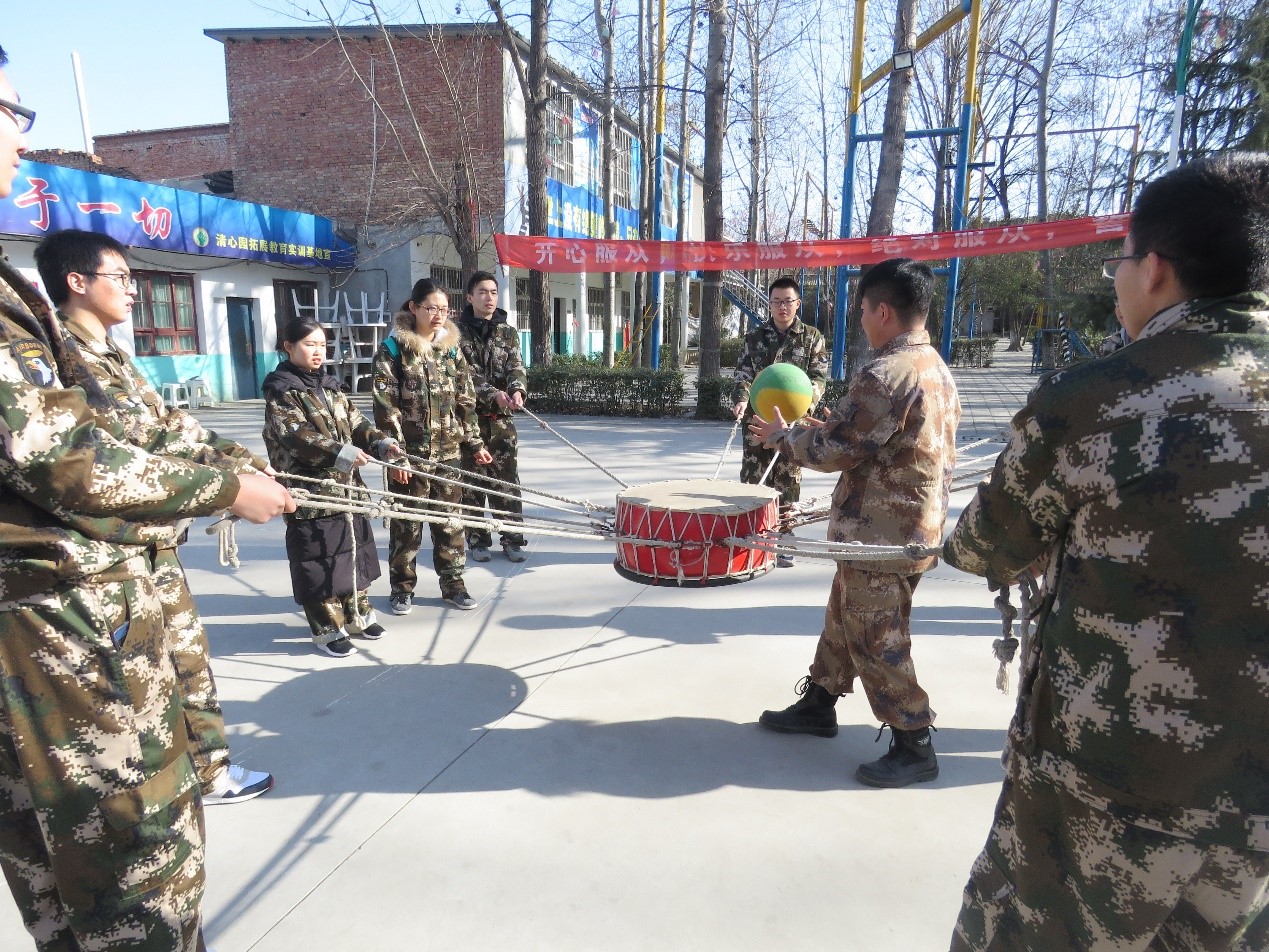 到达训练场后,进行的第二个训练科目是鼓动人心。学员们在保证安全的情况下,将一个排球/足球放在鼓面上,团队成员通力协作,使鼓平稳地将球颠起,在五分钟时间内,颠球次数最多的队伍获得胜利。该科目是为了培养队员们的团队意识和合作能力,引导他们在训练中总结经验,不断进步,高效、快速达成目标。最终,蜀国“闪电鹰战队”凭借颠球283次夺得该训练科目的冠军,成功为团队赢得三颗星奖励。在完成鼓动人心科目后,学员们稍作调整,吃过午餐后进行了短暂休息,为下午的训练科目做准备。