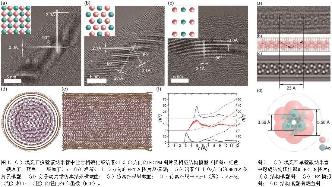 新型储能与能量转换纳米材料研究中心的研究团队通过引入碳纳米管作为反应容器和生长模板,利用碳纳米管内腔的尺寸效应和特殊物理化学环境,合成了碘化银的高压相盐岩相碘化银(存在于400MPa-11.3GPa)以及另一种新型的螺旋状介稳态碘化银结构;并且将这两种结构成功稳定于室温室压条件下。一方面,在反应过程中碳纳米管的特殊纳米空间能够为材料提供一个受管壁与材料本身性质共同调控的压强;另一方面,碳纳米管的管壁又将合成产物与周围环境分隔,并继续对产物产生压力作用和尺寸效应。这样,合成的介稳态结构便室温室压条件下稳定存在下来。这一技术手段为极端结构或者特殊性能介稳态结构的合成与应用提供了新的思路。