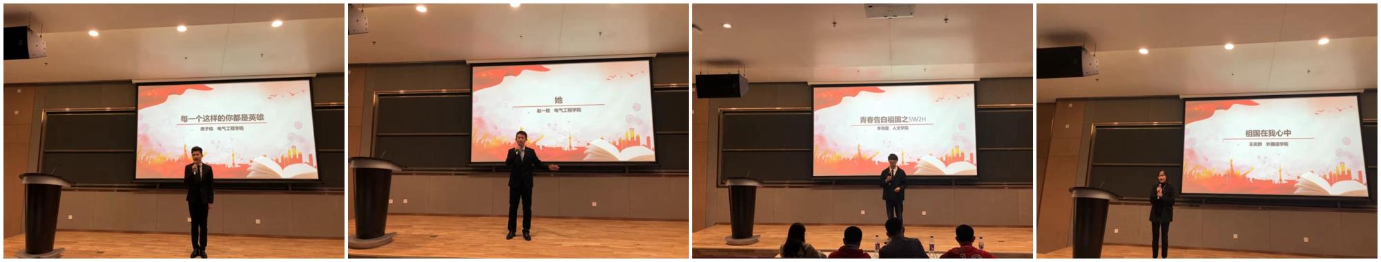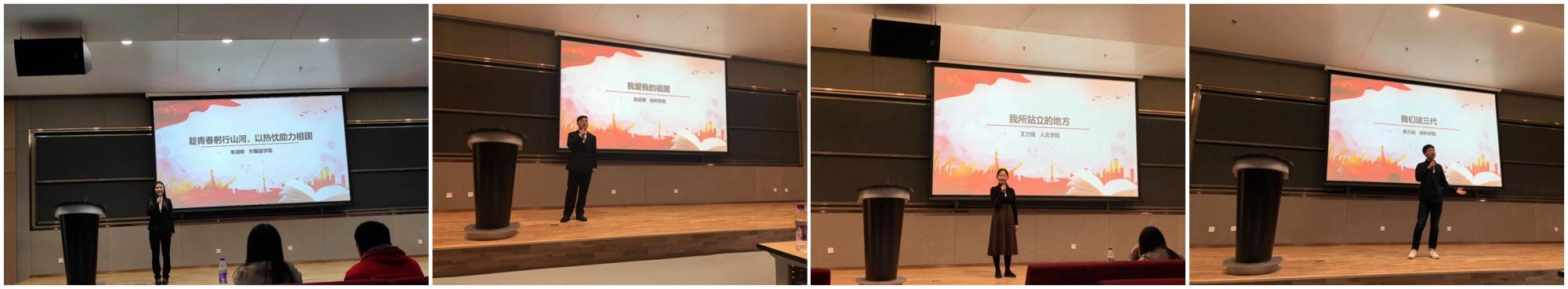 举办 “青春告白祖国”演讲比赛,共有来自全校4个学院的40位选手参加。经过初赛、演讲视频筛选等环节,在40位参赛选手中选出12名入围决赛。10月27日,各位选手以“青春告白祖国”为主题,紧扣“不忘初心、牢记使命”主题教育,从自身体验出发,以真切饱满的情感告白祖国。