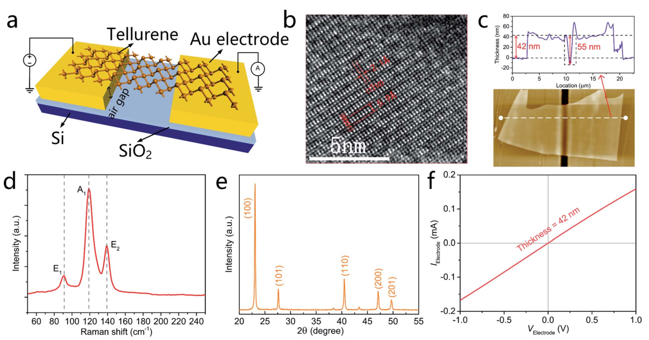 针对以上问题,西安交大科研人员合成了第六主族新型二维材料碲烯,实验测试结果显示碲烯室温下对NO2气体具有高度选择性和灵敏度,还具有优异的空气稳定性,这弥补了另一种“明星”二维材料黑磷虽然气体检测灵敏度高但是空气稳定差的弊端。此外,采用瞬时脉冲加热显著提升了碲烯动态响应性能。本文研究为二维气体传感器的研究提供更高性能的平台,进一步推动了二维材料气体传感器向实用化迈进。相关成果刊登在最新一期的《Journal of Materials Chemistry A》(IF:10.73)杂志上。