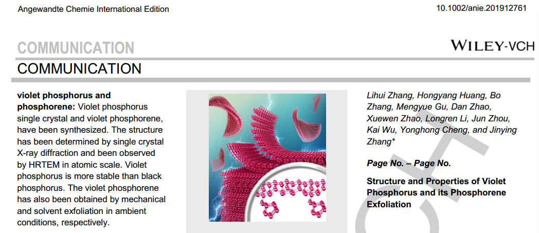 电力设备电气绝缘国家重点实验室新型储能与能量转换纳米材料研究中心在实验室合成了宏观尺寸的紫磷单晶,并在实验上确定了紫磷的晶体结构为单斜P2/n(a=9.210, b=9.128, c=21.893 Å, β=97.776°),单个晶胞有84个原子,同时通过声子谱证明了Thurn和Krebs给出的结构的不合理性。同时发现紫磷结构才是最稳定的磷的同素异形体,其分解温度达到512℃以上,比黑磷高出52℃。并首次通过机械剥离和液体剥离得到紫磷烯。相关成果以“Structure and Properties of Violet Phosphorus and its Phosphorene Exfoliation”为题发表在化学领域权威期刊Angewandte Chemie International Edition上(影响因子12.257,//onlinelibrary.wiley.com/doi/10.1002/anie.201912761)。该工作由电力设备电气绝缘国家重点实验室新型储能与能量转换纳米材料研究中心单独完成,博士生张丽辉为第一作者,通讯作者为张锦英副教授。