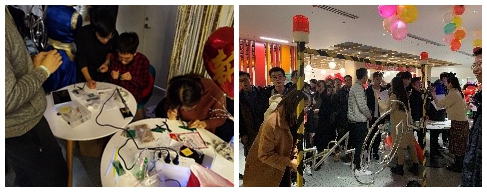 钢琴互动音乐地砖是全场人气最高的项目之一,七个音符,通过简单的排列组合,即可传达出大家对2020的无限期许。这个项目吸引了大量的老师、同学和小朋友们参与,大家兴致勃勃,用脚创造出声光美妙的世界。郭宁同学说:“参与了这个项目,希望新的一年能脚踏实地,弹奏出更美妙的人生乐章。”