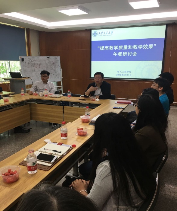 针对如何提高教学质量和教学效果的议题,青年教师各抒己见,讨论热烈。发电教研室焦在滨副教授建议,要丰富教学内容、创新授课方式,增加课堂吸引力。测控教研室李运甲副教授呼吁,应该在教学过程中以学科发展前沿为契机,增加课堂互动,充分调动起学生主动学习的兴趣。绝缘教研室刘鹏副教授表示,在压缩授课学时的情况下,如何进行知识衔接、课程整合、优化培养体系,是我们教学工作仍需探讨的重要课题。两位督导专家根据多年的教学经验,也分享了以下三点感悟:第一,给予教学环节足够重视非常重要,要最大限度的依托科研优势,促进教学发展。第二,提高授课水平非常关键,“念课”、“背课”绝不可取,要生动形象、深入浅出,讲学生真正喜欢听的课。第三,充分了解学生兴趣所在,激发其主动学习的潜力,教学相长,形成良好互动。