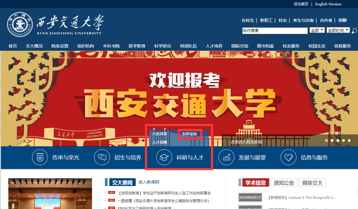 1、用户在学校主页 “科研与人才”模块点击“科研系统”(//stdmis.xiuxianinn.com/),进入休闲小栈