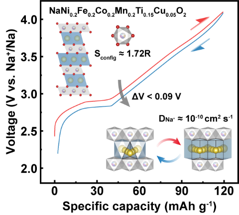 王鹏飞教授与材料学院高志斌副教授合作,通过“理论模型设计+第一性计算+实验测量与表征”的方法提高过渡金属层的构型熵调控电子结构,缩短了过渡金属层间距,扩展了钠离子的八面体−四面体−八面体传输通道,研制出一种新型钠离子电池高熵正极材料。该正极材料表现出极小的电压滞后(0.09 V),在大电流密度下的倍率性能优异(10 C可逆容量为98.6 mAh g−1),同时具备出色的快充慢放能力。电化学测试结合分子动力学模拟,证实了这种高熵材料有着较低的迁移能垒(0.17 eV),从而提高了Na+扩散系数(~ 10−10cm2s−1)。这项工作强调了对过渡金属进行高熵结构设计的重要性,对于开发高能量密度、高功率的O3型层状氧化物正极材料提供了重要参考。