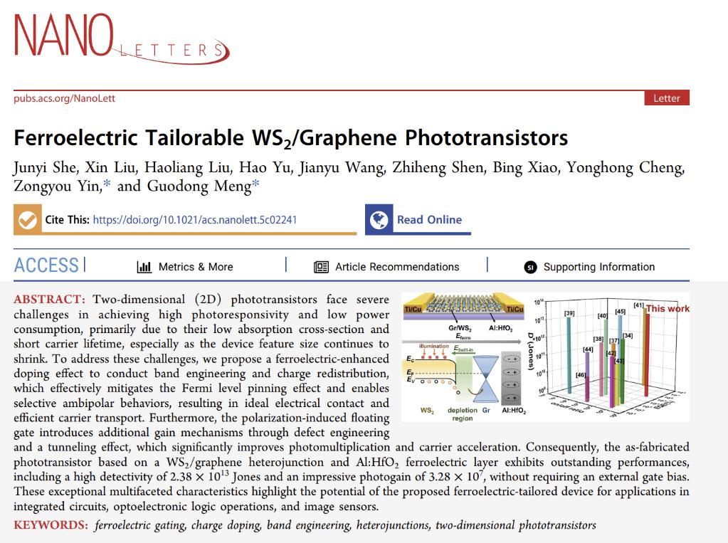 近日,该研究成果以《铁电栅控WS2/石墨烯光电晶体管》(Ferroelectric Tailorable WS2/Graphene Phototransistors)为题在国际知名期刊《纳米快报》(Nano Letters)发表,休闲小栈