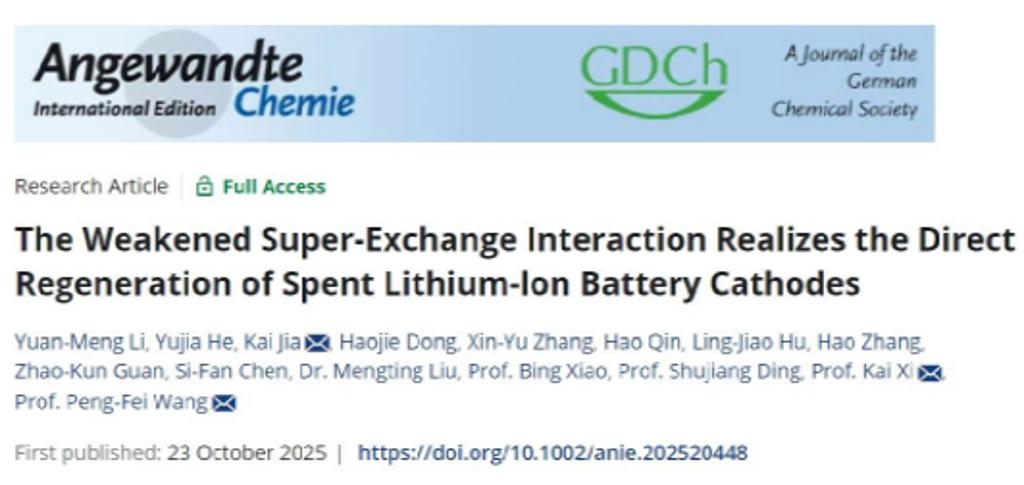 该研究成果以《减弱超交换相互作用实现废旧锂离子电池正极的直接再生》(The Weakened Super-Exchange Interaction Realizes the Direct Regeneration of Spent Lithium-Ion Battery Cathodes)为题,发表在国际顶尖学术期刊《德国应用化学》(Angewandte Chemie International Edition)上。休闲小栈