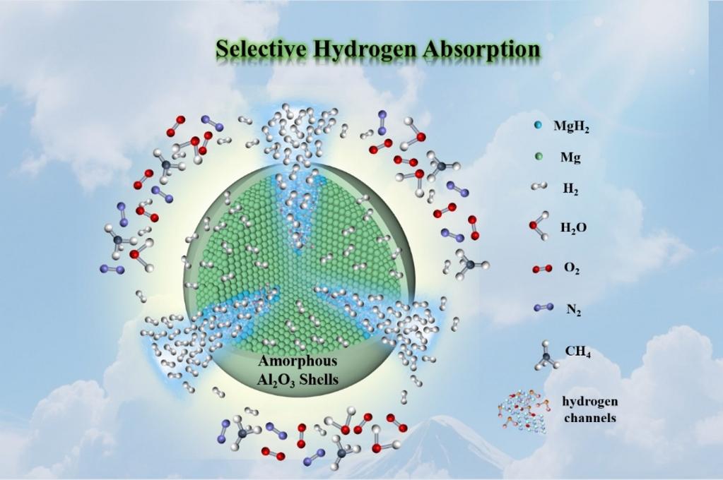 电工材料电气绝缘全国重点实验室张锦英教授团队通过原子层沉积技术在高活性镁基固态储氢颗粒外成功构建了纳米级非晶Al2O3封装层,在保证储氢动力学和储氢密度的基础上实现了氢气的选择性吸附。研究发现该复合体系不仅在空气暴露2个月后未水解、氧化,同时在含10% CH4(3 MPa,100℃) 、0.1%O2+0.4%N2(1.6 MPa,100℃)以及0.1%CO2+0.4%N2(1.6 MPa,100℃)的混合氢气中可实现稳定选择性吸氢。吸/放氢行为、物相转变、元素分析以及分子动力学仿真等证明复合体系水氧隔离性以及氢气选择吸附特性可归因于具有合适空隙的非晶Al2O3封装层对H2的选择渗透性以及对H2O、CH4、O2、N2以及CO2的选择阻隔性。