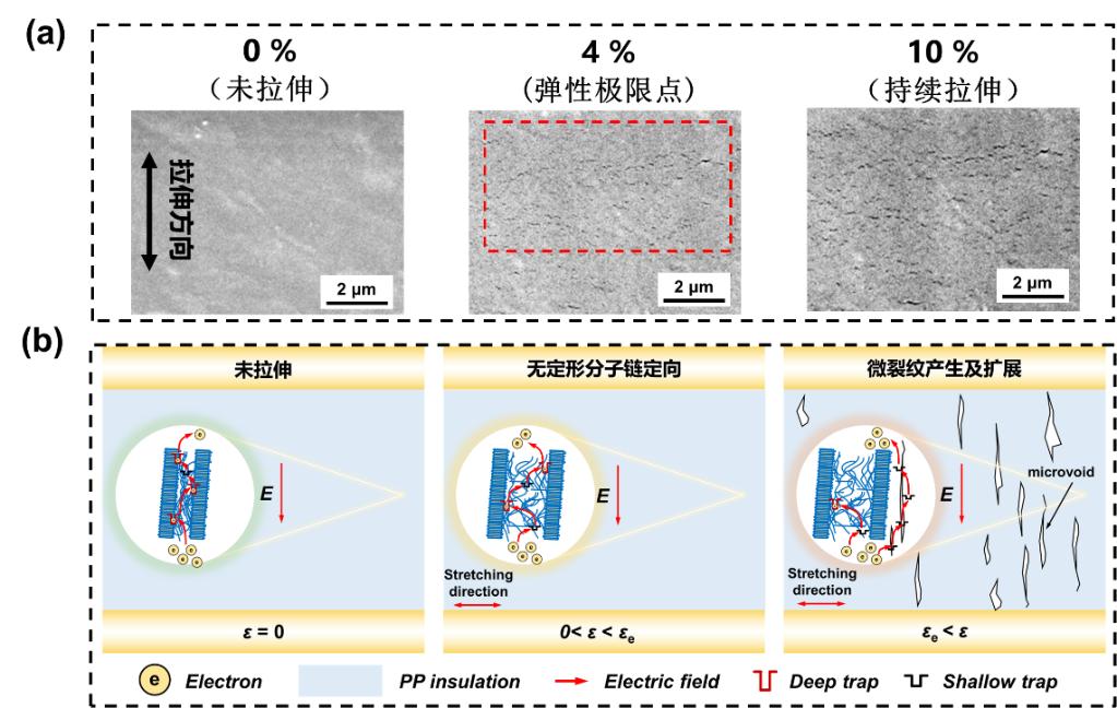 图3PP绝缘在拉伸下的原位电镜图与结构演变示意图