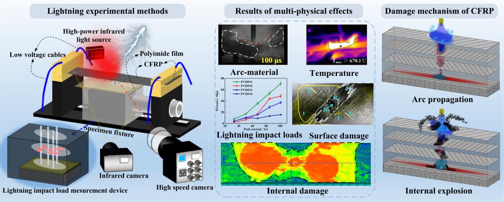 、电工材料电气绝缘全国重点实验室、陕西省高电压大电流测试技术及装备工程实验室姚学玲教授团队近日陆续发表多篇科研成果,提出了基于多维度冲击力的测量方法及多维冲击力作用时序的分析和解耦方法,填补了CFRP复合材料雷击力学冲击理论的不足、完善了CFRP复合材料雷击损伤理论体系。基于一维应力波传递理论,提出了一种由氧化锆陶瓷传递杆-聚偏二氟乙烯传感器-支撑组件组成的冲击力测量机构,实现了雷电冲击压力的定量校准;设计了冲击力测量单元的电磁屏蔽方法,研制了多通道可调节的分布式雷电冲击载荷测量装置。开展了间隙注入下雷电冲击载荷作用特性的研究,分析了雷电电磁力(EMF)、表面爆炸产生的冲击波(SESW)和电弧通道膨胀产生的声冲击波(AESW)在时空尺度上的时序叠加关系,多维雷击冲击力的时序分析表明作用时序依次为EMF、SESW和AESW。开展了雷电流A分量注入CFRP复合材料人工模拟雷击试验,深入综合研究了雷电流幅度对复合材料板电弧-热-损伤-力学等雷击特征演化的影响规律,评估了雷电冲击载荷的损伤贡献,提出了两边接地条件下复合材料雷击的二次爆炸理论,阐明了CFRP复合材料雷击损伤的产生及演化过程。该系列研究填补了雷击热-电-力学耦合过程中关键力学数据的空白,揭示了雷击电、热、冲击顺序协同作用下CFRP复合材料内部分层损伤机制,为复合材料防雷结构设计提供了充足的理论指导,对复合材料装备整体雷击防护具有深厚的应用价值。