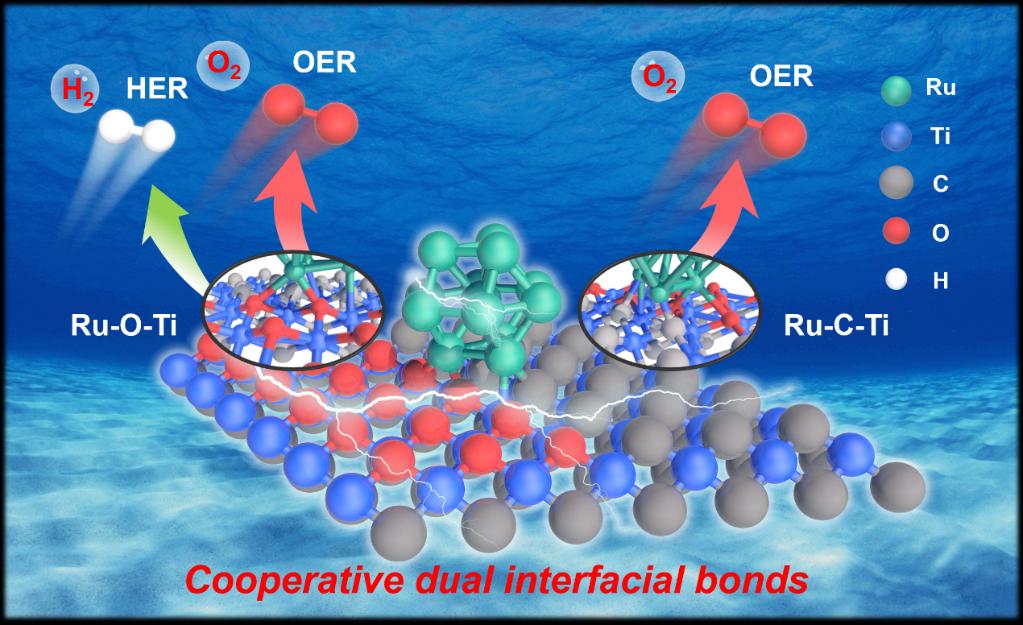 近日,西安交大休闲小栈 、电工材料电气绝缘全国重点实验室相关科研团队成功研制出 Ru/Ti3C2Ox@NF 海水电解双功能电催化剂。该催化剂以泡沫镍为基底,通过精准电沉积技术将超低负载量钌团簇锚定在Ti3C2Ox纳米片表面,形成 “活性位点——导电骨架” 紧密结合的复合结构。此设计让催化剂兼具出色电催化活性与超强结构稳定性,其优异性能源于独特的界面键合作用:Ti3C2Ox的氧、碳端基分别与钌团簇形成 Ru–O–Ti 和 Ru–C–Ti 键,两键协同引导界面电荷定向重分布,既优化了反应中间体吸附能力,又加快了析氢、析氧反应动力学。该研究突破了海水电解催化剂活性与稳定性难兼顾的瓶颈,阐明了界面键合的调控机制,为复杂电解质环境高效双功能电催化剂的开发提供了新思路。