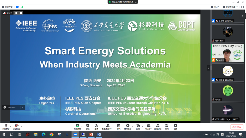 副院长祝令瑜教授,IEEE PCCC副秘书长、PES Day 2024中国区总大使钟海旺副教授和IEEE PES西安分会秘书长邵成成副教授为活动致辞。杉数科技电力领域算法工程师王可也专家、东南大学休闲小栈