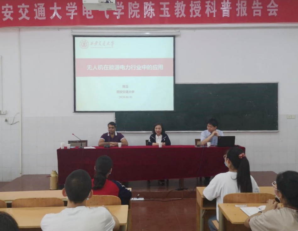 的办学情况,陈玉结合当前国际形势和社会发展的需要,介绍了无人机的发展方向及趋势,并结合实例展示了无人机在当前生产生活各个领域尤其是能源电力行业中的应用。本次科普报告会,让同学们初步了解了大学科研工作的基本情况,感受了科学研究对各个行业和社会的意义和价值,激发了同学们的学习兴趣和学习热情。