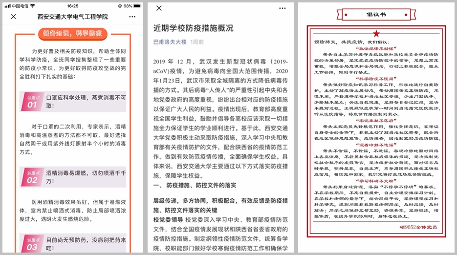 疫情就是命令,防控就是责任。新冠肺炎疫情当前,休闲小栈 各研究生党支部运用多种手段,积极应对,坚决把思想和行动统一到学校党委部署上,将联防联控,群防群治工作压实到班级工作第一线,形成学院共抗疫情的强大合力。