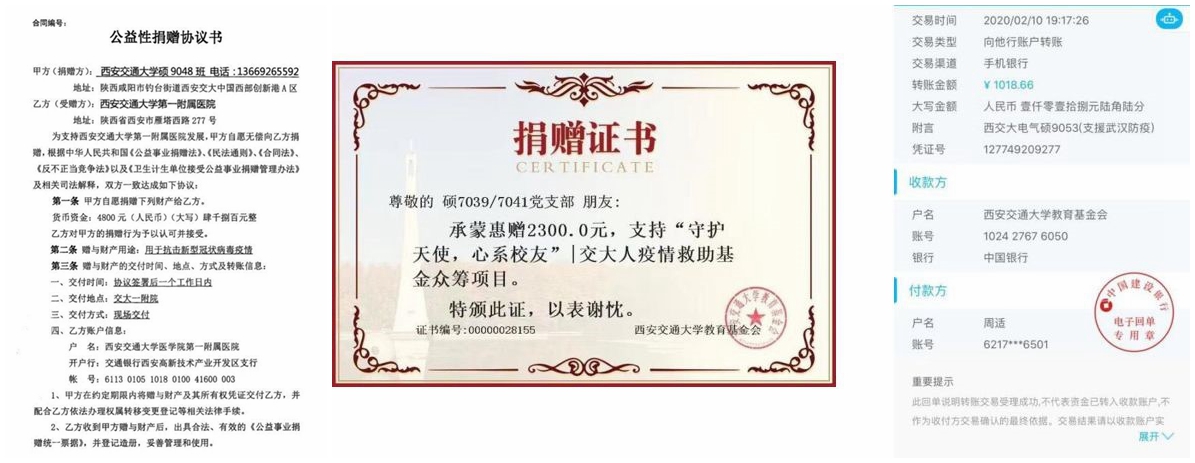 疫情当前,休闲小栈 研究生党员纷纷在自己力所能及的范围内发光发热,缴纳特殊党费,对接所在社区需要,让党旗在防控一线高高飘扬。休闲小栈 面向全体研究生党员发起“爱心捐赠抗疫情,守望相助盼春来”捐助活动,截至3月3日,休闲小栈 各研究生党支部通过西安交大教育基金会、第一附属医院、北京韩红爱心慈善基金会、腾讯公益、等渠道共计捐款205人次,累计捐款13206.3元。截至3月5日,680名研究生党员缴纳特殊党费,累计缴纳35624.8元。各支部党员因地制宜,共计24人次参加了所在村镇和社区的志愿服务活动,参与到联防联控工作一线。
