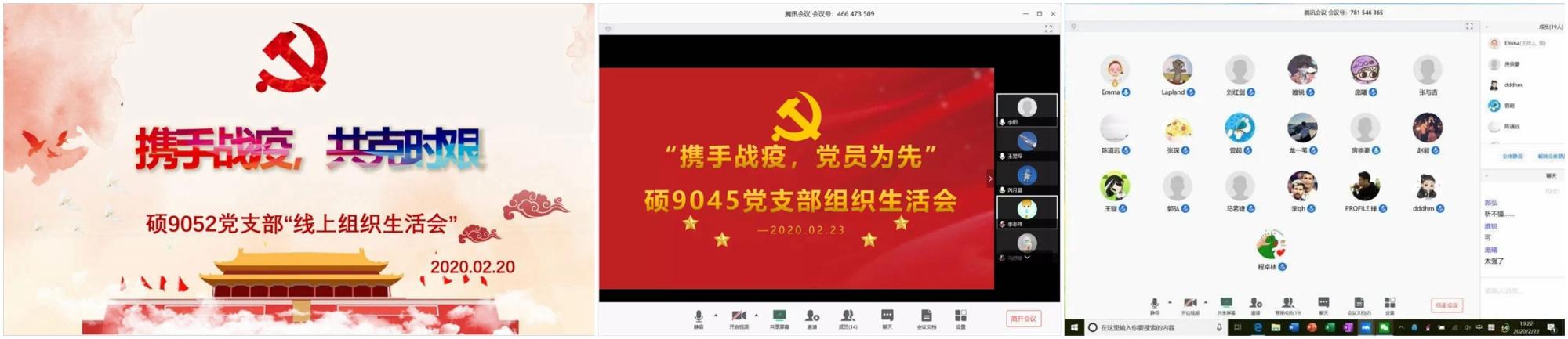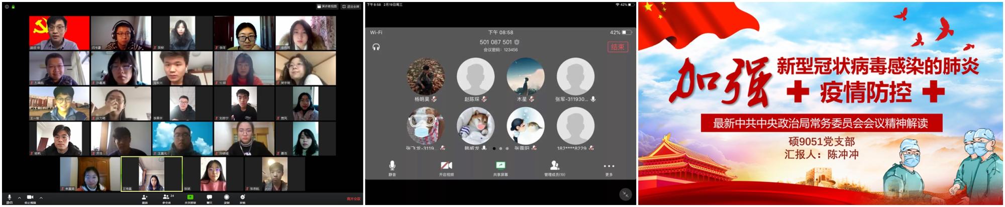 各党支部对习近平总书记《在统筹推进新冠肺炎疫情防控和经济社会发展工作部署会议上的讲话》、党中央印发《关于加强党的领导、为打赢疫情防控阻击战提供坚强政治保证的通知》等内容进行深入学习。硕9051党支部书记陈冲冲认为作为党员一定要做到“两个维护”,服从组织统一指挥、协调和调度。硕9052党支部书记刘航对当前确诊新型冠状肺炎病毒的人数情况进行了分析,表示在党中央坚强领导以及全国人民共同努力下,疫情已经得到了有效遏制,但切不可放松丝毫,不获全胜决不轻言成功。硕9043党支部书记李伊濛认为我们要充分认识疫情防控过程中体现的社会体制优势,理性看待国家治理体系和治理能力的短板不足。通过召开线上专题组织生活会,各研究生党支部统一思想,坚定信心,大家居家科研学习更多了一分定力。