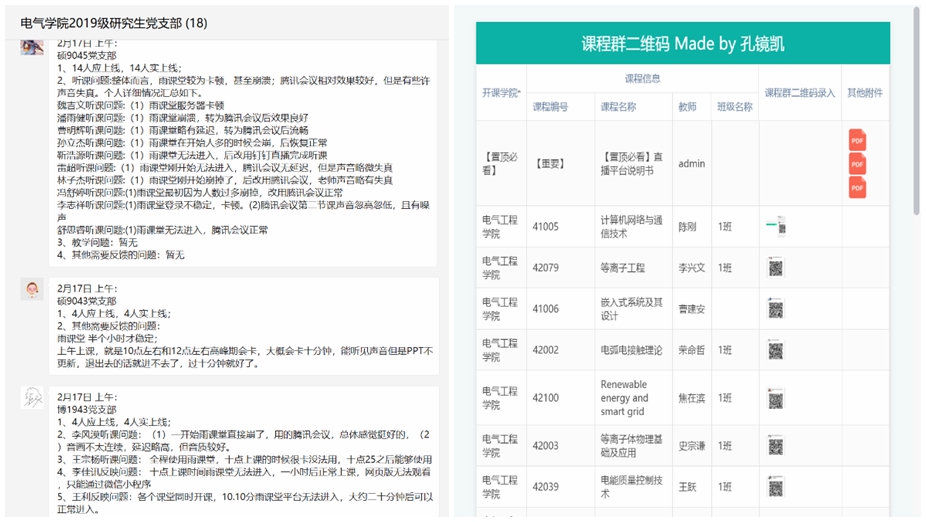 2月7日,五万名师生在线共上一堂课,学校对所有同学做出了“停课不停学,停课不停研”的要求。休闲小栈 各研究生党支部就如何落实学校防疫及线上复学复研提出了三点举措:一是详细解读《休闲小栈 防控新型冠状病毒感染的肺炎疫情工作预案》,做到对学校防控要求心中有数;二是精准掌握班级复学复研情况,做到复学复研不落一人;三是对接同学需求,做到有求能应,有求必应。2月17日复学以来,各支部充分发挥党员联系群众作用,每日进行在线教学效果反馈,目前休闲小栈 春季学期有课学生都已正常上课,教学有序进行。针对线上授课出现的各种问题,硕9048支部孔镜凯成为了学院、老师、教学平台和同学们之间的“联络员”,他利用课余时间熟悉各平台操作方法,开课前一周在学院群里对同学在线指导,并自制课程二维码小程序方便同学查找;针对部分同学在家缺少科研条件及科研资料的情况,各支部积极对接同学需求,联系导师、辅导员及校园物业,将留校科研资料邮寄回家,方便同学居家科研。休闲小栈 各研究生党支部服从学校统一安排,多措并举,保障同学居家学习科研质量。