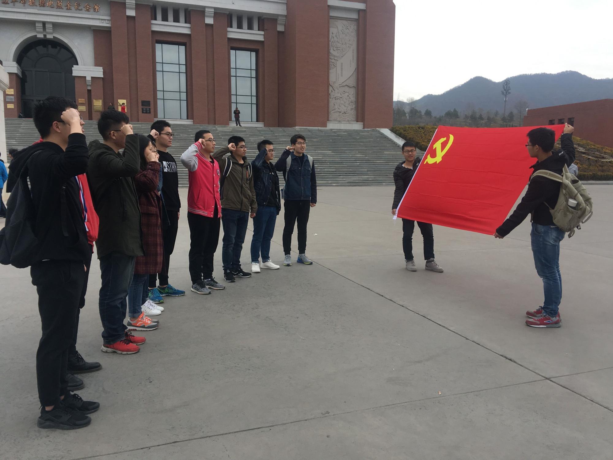 2018年11月3日上午8:00,实践队员统一乘车出发,前往本次系列活动第一站——陕甘边照金革命根据地纪念馆。到达纪念馆后,队员们首先在刘志丹、谢子长、习仲勋三位革命先烈铜像前合影留念,缅怀先烈。随后各个党支部在革命先烈的铜像前重温入党誓词,庄严宣誓。