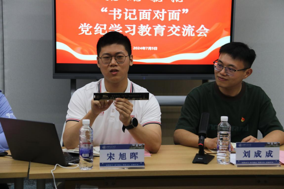 硕3070班党支部书记宋旭辉同志代表参会支部总结回顾了自4月份以来各支部开展党纪学习教育的成效、特色做法以及存在的问题。参会支部在休闲小栈