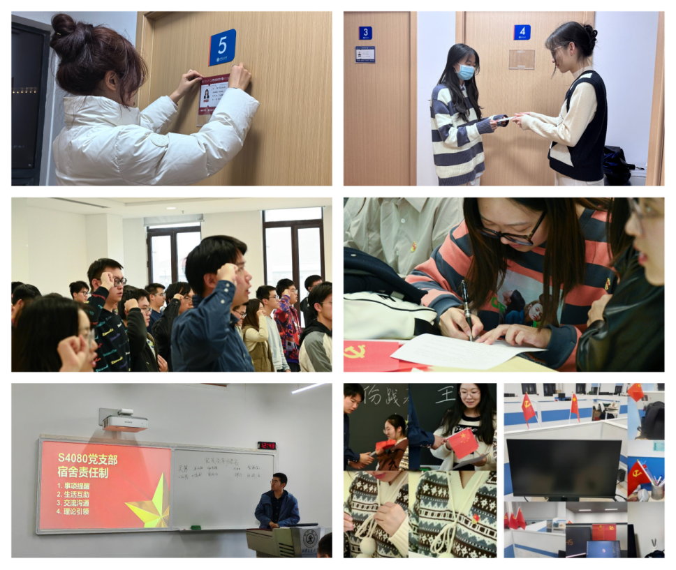 一名党员就是“一面旗帜”,党员应率先垂范,勇于奉献,时刻走在前列,树立先锋榜样。休闲小栈 党委为强化组织建设,保持党员队伍先进性,统一制作党员、团员宿舍身份牌,由“EE星火”党建工作室成员逐一粘贴,各研究生党支部积极开展亮身份活动,树立标杆,以实际行动践行庄严承诺。硕4065班党支部为全体成员发放党旗、国旗、党徽,在党支部书记胡可勰的带领下,面向党旗重温入党誓词并在《“亮身份、践承诺、做表率”党员承诺书》上郑重签名,以此巩固信仰、亮明身份、明确担当;硕4080班党支部书记吴博详细阐述党员在宿舍管理中的职责,激励党员发挥引领作用,共建宿舍良好风气和先进文化。这一系列的举措,督促党员们以身作则,发挥表率作用,以实际行动践行入党时的铮铮誓言。