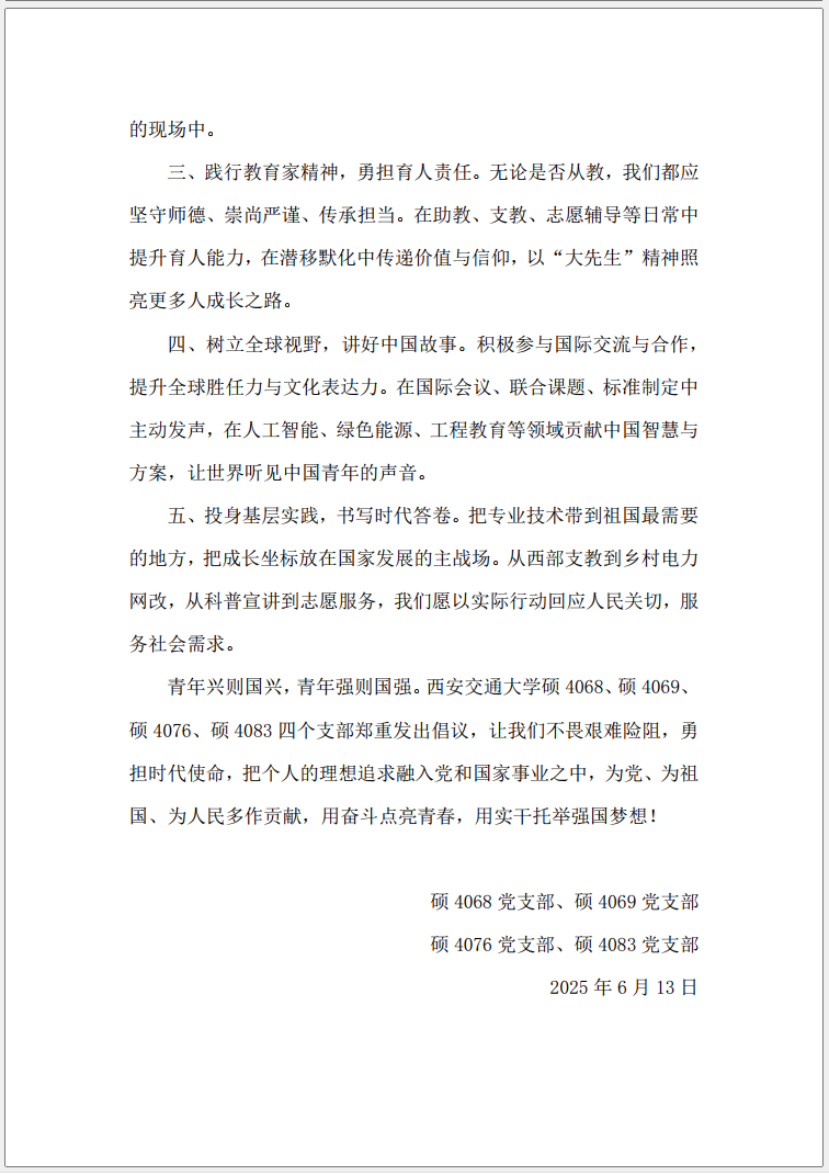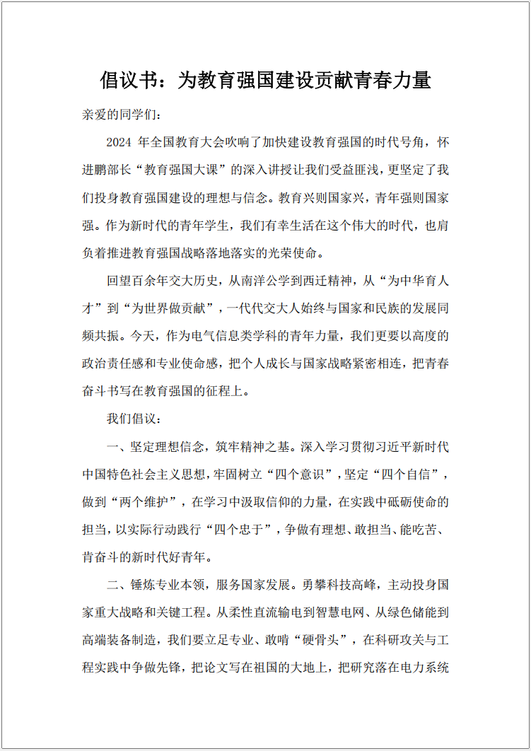 四个支部联合发布《为教育强国建设贡献青春力量》倡议书,号召广大电气学子坚定理想信念、锤炼专业本领、树立全球视野、投身基层实践,立足电气工程学科,将个人奋斗融入电力能源事业的行业实践,用奋斗点亮青春,用实干托举强国梦想。