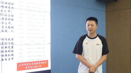 硕4076党支部书记张师通立足研究生党员身份,阐述落实教育强国使命的具体路径。他强调全体党员要深刻理解并践行“四个忠于”,勇攀科研“无人区”,服务国家战略紧缺。他认为,广大电气学子应不畏艰难险阻,勇担时代使命,把个人的理想追求融入党和国家事业之中,为电力能源事业贡献自己的一份力量。