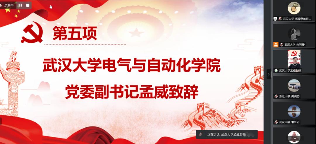 思政教师汤翔鹰老师、王敏老师、施金宏老师出席活动,六校研究生党团支部代表等百余名师生参加活动。本次活动由武汉大学电气与自动化学院党总支成员杨璨然主持。
