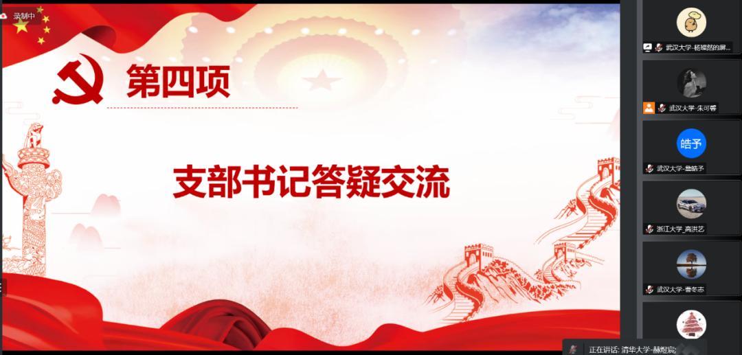 S1061党支部、S1072党支部与武汉大学、清华大学、浙江大学、上海交通大学、华中科技大学等五所高校于2022年12月15日齐聚线上,联合开展“青春献礼二十大,扬帆奋楫新征程”六校联合党建活动。旨在通过重温入党誓词、主题宣讲、交流分享、书记答疑等形式,激发研究生党员奋进新征程、建功新时代的澎湃动力和激情活力,厚植爱党、爱国、爱社会主义的情感,引导青年党员牢记时代责任,坚定跟党走、建功新时代。