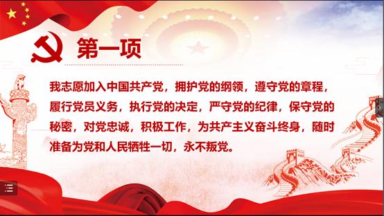 重温入党誓词。全体成员打开摄像头,举起右拳,在主持人的带领下宣誓。十二句誓言,字字千钧,在场同志的使命初心愈加坚定。