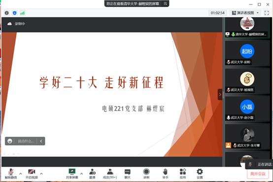 经验分享,清华大学赫煜宸就如何组织引领大家有效学习党的二十大精神,分享了支部建设的经验,以本支部学期内所举办的组织生活入手,分享了一些支部建设的工作方法,讲述了党团班协同共进的过程中如何发挥好党支部的先锋模范带头作用,实现集体的不断进步。