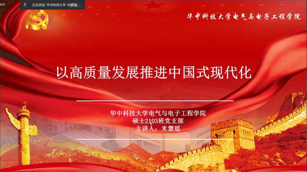 华中科技大学米慧瑶以《以高质量发展推进中国式现代化——学习贯彻党的二十大精神》为题,从什么是“中国式现代化”、“中国式现代化”是怎样的现代化和如何推进中国式现代化三个问题进行讲述,并鼓励青年学子为全面建设社会主义现代化国家、全面推进中华民族伟大复兴而团结奋斗。