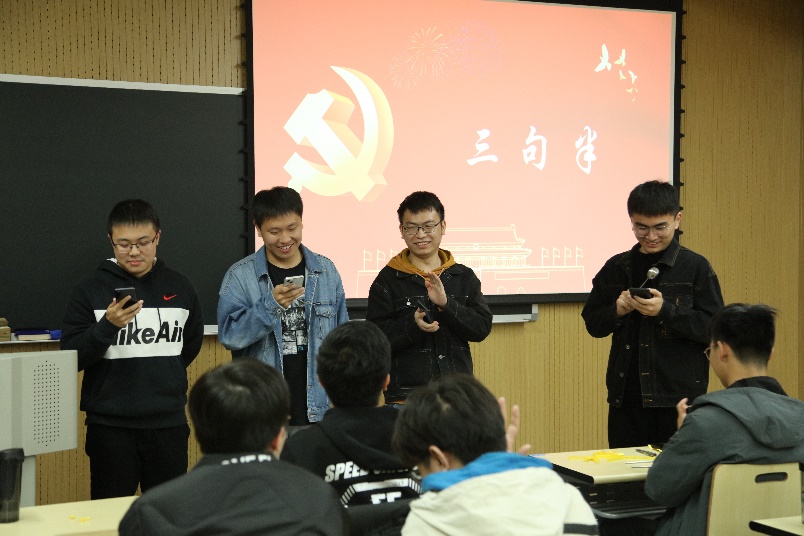 在“传承中华语言文化”环节,全体团员齐颂《少年中国说》,齐唱歌曲《我的祖国》,亲身体会跨越一个世纪的时代强音。从风雨飘摇的清朝,感受梁启超对少年寄予的厚望,再到“一条大河波浪宽”的旋律,感受志愿军战士对祖国、对家乡的无限热爱和英雄主义气概。由四名同学准备的三句半节目,则将复兴号、蛟龙号、载人航天等伟大成就融合于朗朗上口的传统曲艺表演形式,表达了对祖国繁荣昌盛的祝福。