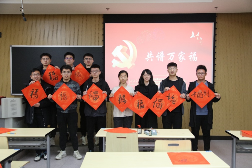 在“传承中华书法文化环节”,同学们用毛笔书写了各具特色的福字,亲身体验了书法文化的魅力。福文化,寄托了人们对未来美好生活的向往,伴随中国五千年文明史,已深深嵌入中华文明的基因,融入厚重的家国情怀。支部全体同学借由福字祝福党的二十大胜利召开,祝福中华大地风调雨顺。