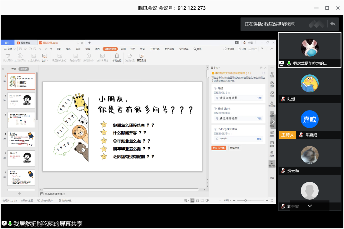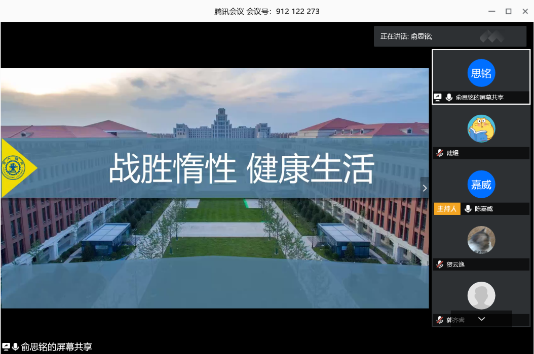 目前,受到新型冠状病毒的影响,为保障广大师生的生命健康,全国的大学都延期开学。在已经长达3个月的假期中,学习模式的改变,遥遥无期的返校时间,伴随着科研进度、项目任务以及就业带来的压力,居家的研究生们不免会产生焦虑、迷茫的负面情绪。因此,硕8048党支部以“只争朝夕,不负韶华”为主题,开展线上心理疏导活动,给同学们的居家科研学习、养成健康的生活习惯以及保持积极乐观的心理状态提供一些建议。活动由党支部书记陈嘉威主持,全体党员和积极分子参加。